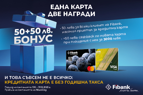 - Всеки клиент с активна сметка, открита в Fibank, преди 01.10.2025 г., препоръчал на приятел да издаде и активира кредитна карта от банката, ще спечели 50 лв.