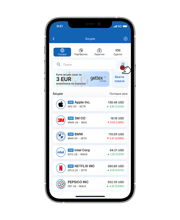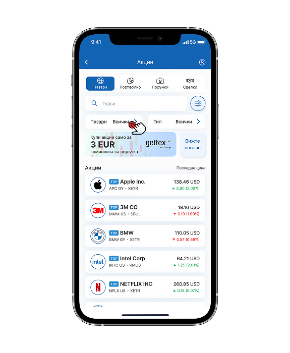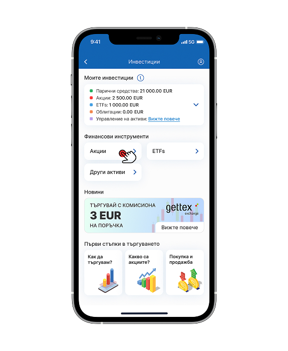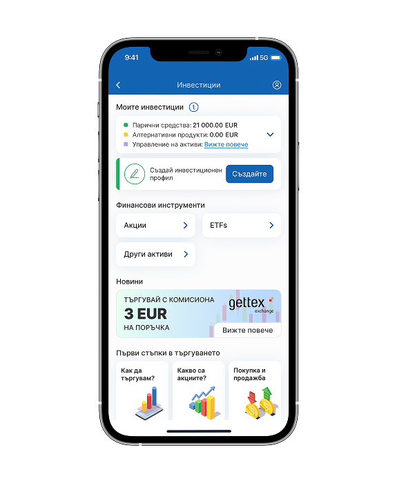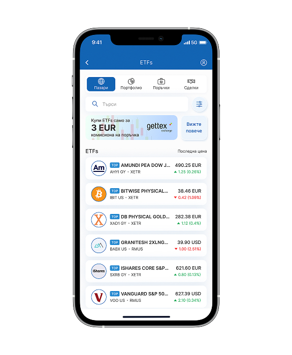 Gettex е изцяло електронна фондова борса за търговия, която позволява на частни и институционални инвеститори да търгуват с акции и ETF-и. Тя вече е налична в мобилното приложение My Fibank.