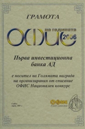 На специална пресконференция бяха обявени и връчени наградите от конкурса "Офис на годината", организиран от сп. "ОФИС". Приза "Офис на годината 2006" грабна Първа инвестиционна банка с офиса си, разположен на бул. "Драган Цанков". Владимир Събев, председател на конкурса, връчи наградата на Матьо Матеев, Изпълнителен директор и Председател на УС на ПИБ. За първи път в тригодишната история на конкурса банка печели престижната награда.